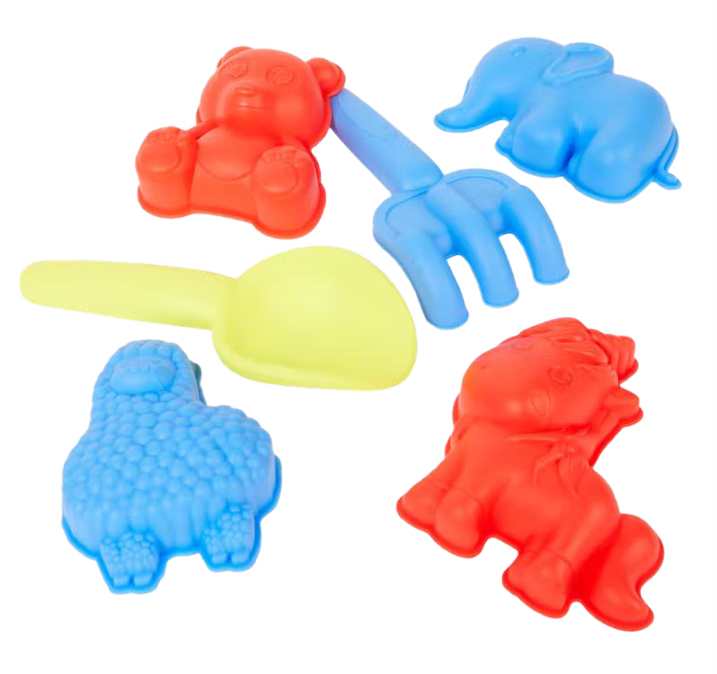 W zestawie: 4 foremki ze wzorem zwierzątek, grabki i łopatka