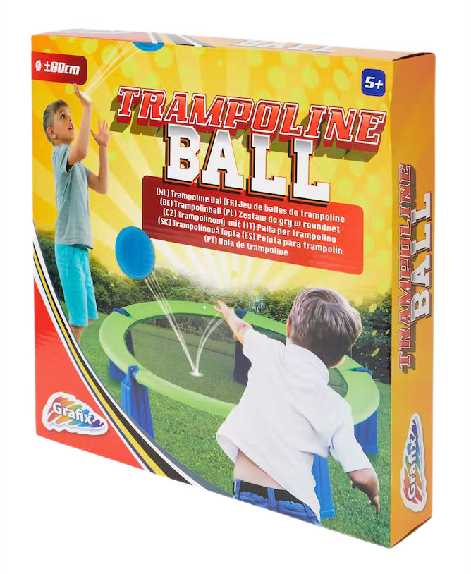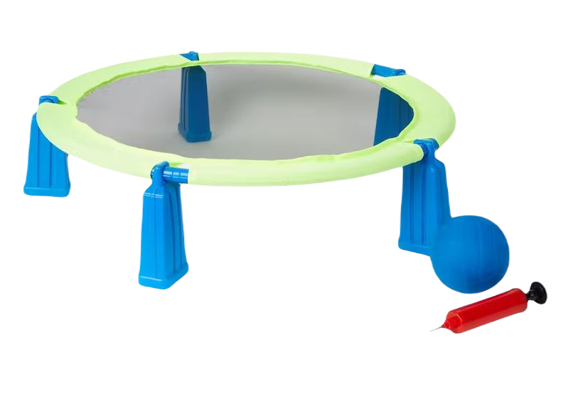 Zestaw do gry składa się z obręczy, napiętej siatki i 5 nóżek – tworzących trampolinę – oraz gumowej piłki.