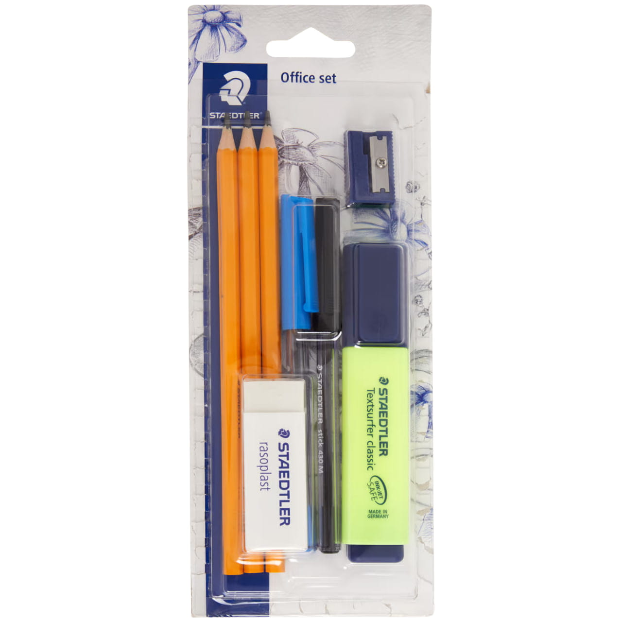 Pracuj wydajnie dzięki zestawowi biurowemu od firmy Staedtler. W zestawie 3 ołówki, temperówka, 2 długopisy, 1 marker, gumka. Zestaw równie odpowiedni do szkoły jak i do biura oraz użytku domowego.