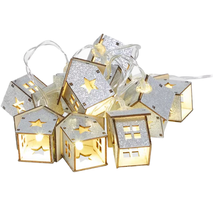 Zimowy łańcuch świetlny 10 LED brokatowe domki 120 cm srebrny