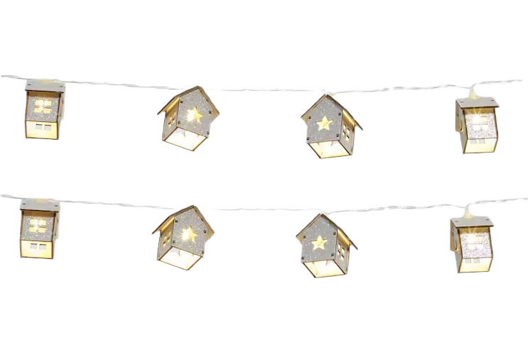 Dzięki temu ładnemu łańcuchowi świetlnemu Twój dom stanie się bardzo przytulny. Jest dostępny w różnych wariantach, więc zawsze znajdziesz coś odpowiedniego dla siebie. Na każdej girlandzie jest 10 domków. Ładnie wygląda na przykład po przymocowaniu do regału ściennego lub przepleciony przez girlandę.